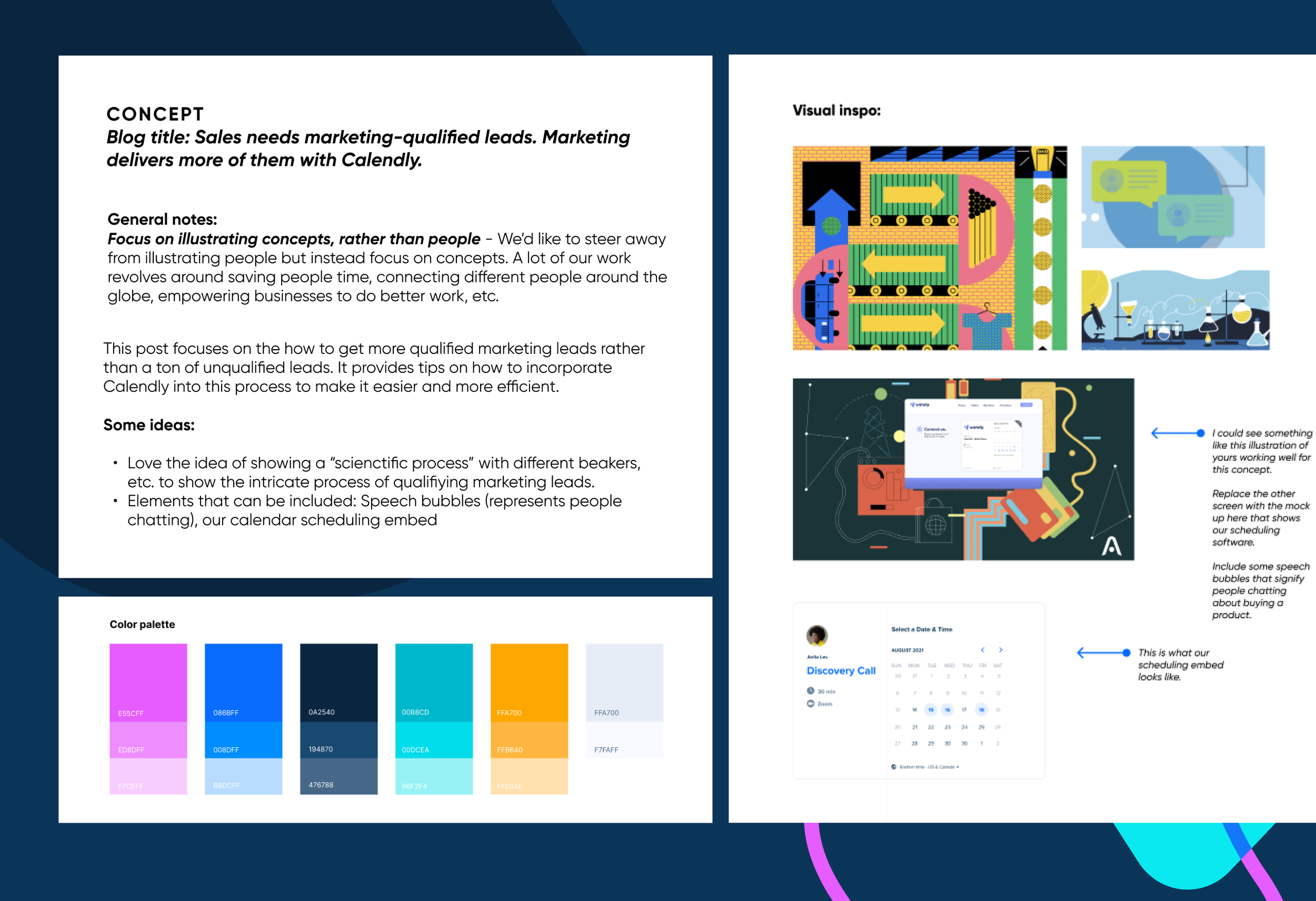 In 2022, the Calendly content team decided they wanted to redesign the illustrations style used on the blog at the time. The team was finding that compared to what was in the market, the current illustration style was starting to feel outdated and needed to be refreshed. I was tasked with developing the new style for the illustrations and sourcing illustrators who could create new art for our highest performing blog articles.