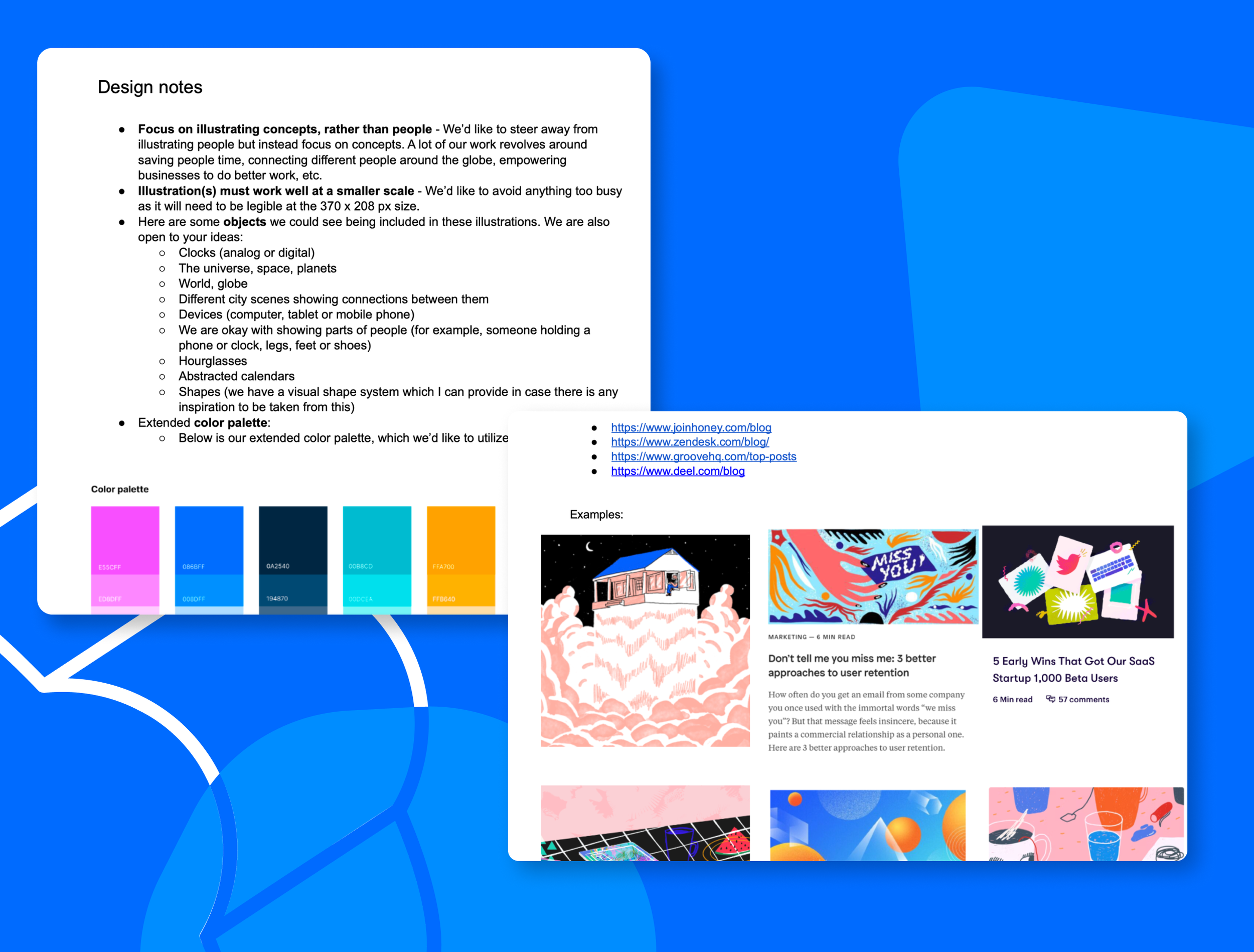 Once I developed the style guidance for illustrations, I moved onto sourcing illustrators who I felt would adapt to our style well while still bringing their own creative touch. After procuring the illustrators, I developed a series of creative briefs specific to each blog article with a summary of key points to highlight and examples of illustrations for inspiration.